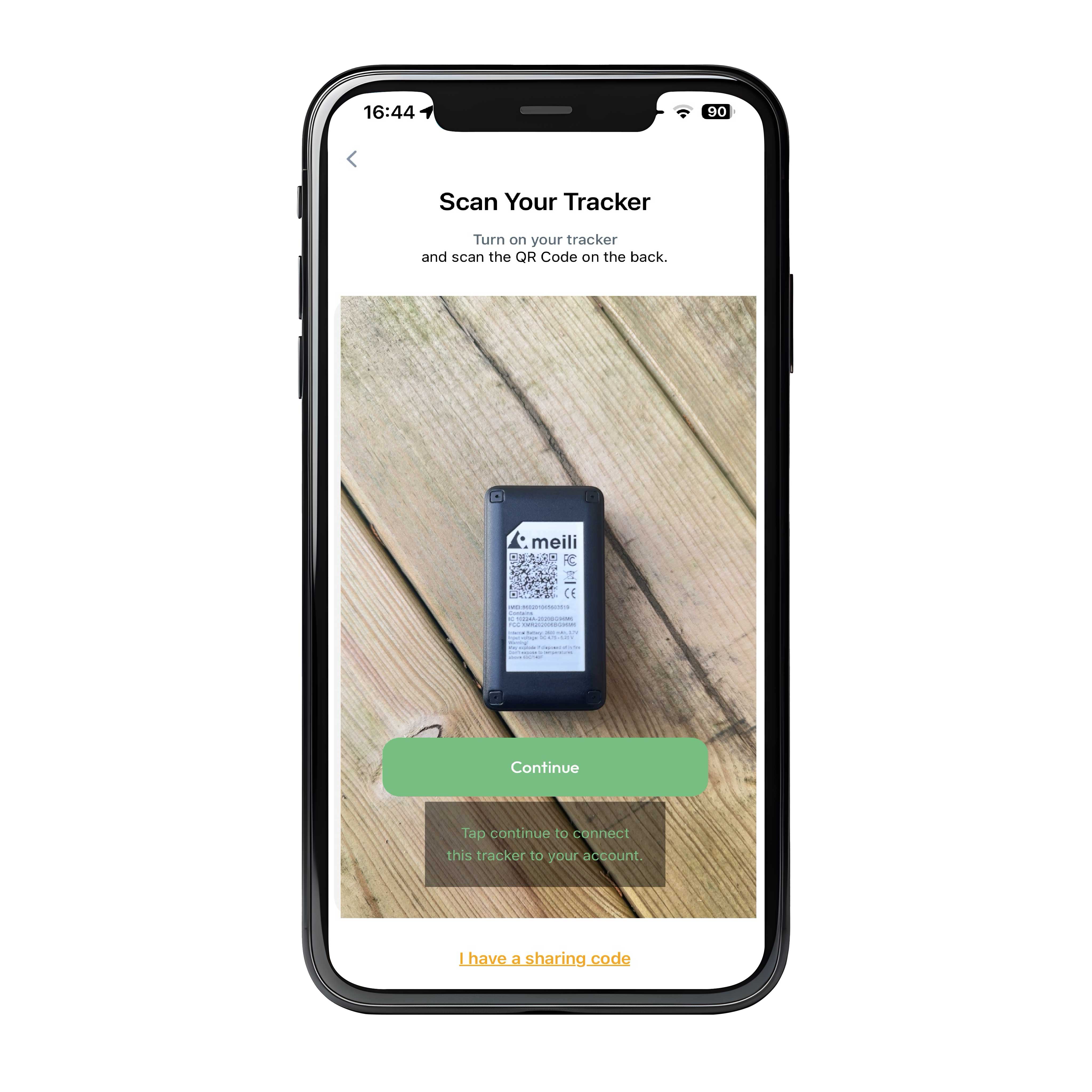 Then follow the on screen instructions, and Scan the QR code either on the Meili GPS Tracker itself or on the back of the Quick Start Guide that came in the box.